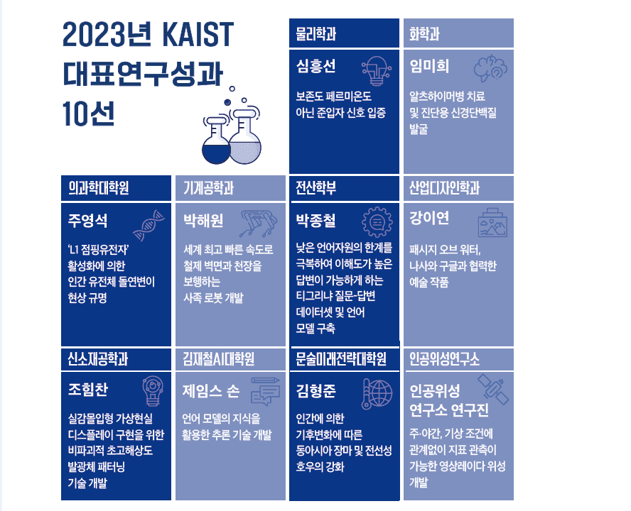'KAIST 2023년 대표 R&D 연구성과 10선'도 소개된다. 심흥선(물리학과)·임미희(화학과)·주영석(의과학대학원)·박해원(기계공학과)·박종철(전산학부)·강이연(산업디자인학과)·조힘찬(신소재공학과)·제임스손(김재철AI대학원)·김형준(문술미래전략대학원)·인공위성연구소 연구팀 등이 지난 한 해를 대표하는 우수 연구를 수행한 것으로 평가받았다.